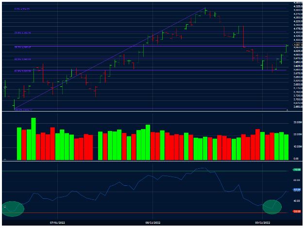 All the major indices finished in the green, snapping multi-week losing streaks. The DOW finished up 2.66%; S&P up 3.65%; and the NASDAQ took the cake up 4.14%.