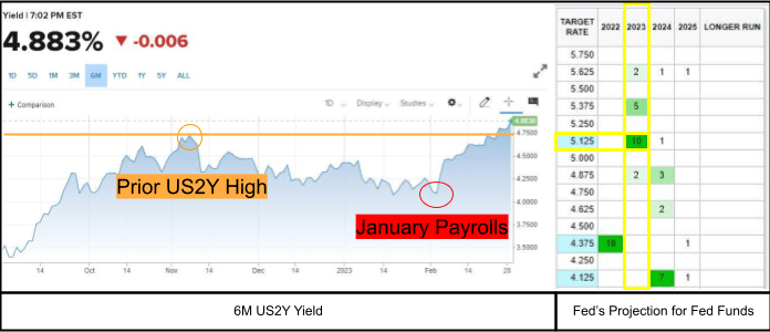 My projection assumes February Payrolls, releasing March 10th, will showcase a resilient economy, supporting a terminal rate between 5.0 – 5.5%. However, it will not be a repeat of the record strength from January, discrediting the need for Fed Funds north of 6%.