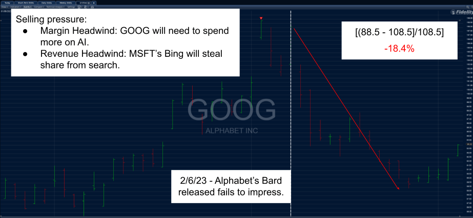 Regarding the traditional internet search and advertising industry, I believe Chat GPT-esque applications will evolve into a disruptive threat. Alphabet’s (GOOG) multi-year investment in Bard, an AI application similar to Chat GPT, is an admission of this threat. While I feel it is too early to price-in this threat, it did not stop the market from making an attempt in GOOG shares.