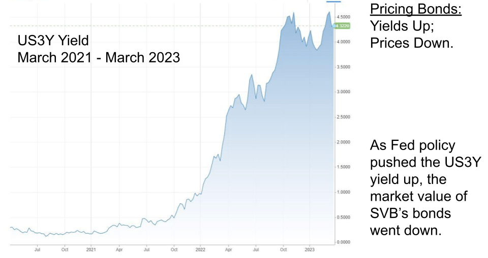 CNBC on-air programming reported this particular bond portfolio had a large exposure to three-year U.S. treasuries (US3Y). Since early 2022, the Fed has been raising the Fed Funds rate, which caused the US3Y yield to rise with it. The relation between bond yields and bond prices is inverse: as yields increase, prices decrease. Consequently, when SVB sold that bond portfolio, they realized a $1.8B loss.