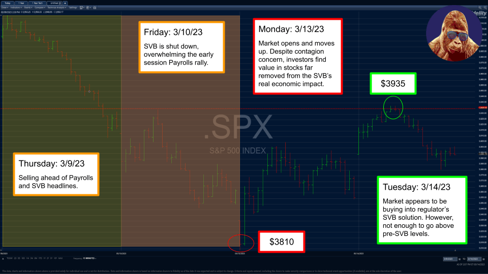 On the upside, I have identified $3,935. This is the level today’s relief rally, catalyzed by in-line CPI and a warm reception to the initial regulator plan, faded. This price level is synonymous with the high reached before the Payrolls rally reversed on the SVB news. Breaching this level implies the market has increased confidence in regulator plans or has incremental evidence to suggest contagion will be contained.