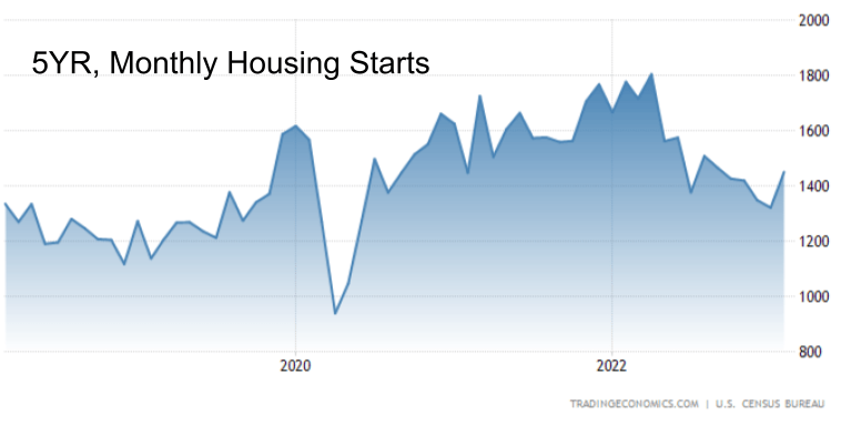 - In February, housing starts rebounded nicely. The 1.45M figure is well above the 1.31M estimate and January’s 1.32M. While this rebound will not immediately impact housing inflation, it is reassuring that housing starts avoided making another new low. Going forward, I expect this rebound to continue as the “flight to safety” prompts homebuilders to take advantage of lower interest rates.