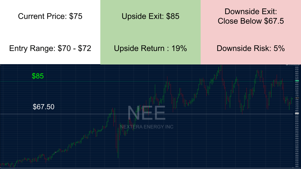 NEE is a utility company with one of the largest exposures to renewable energy solutions in the U.S. It offers shareholders the dividend and stability of a utility with superior future growth (compared to peers) backed by stimulus from the Inflation Reduction Act. While NEE is not cheap, trading at around 35x TTM earnings, it successfully tested multi-year support at $70 earlier this month. Although I would be comfortable starting a position at this level, it is worth noting that I expect an opportunity to buy it a few ticks lower.