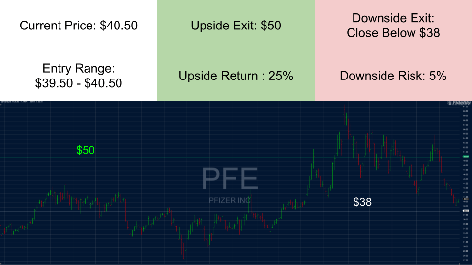 Full disclosure, I am a long-term investor in each of these names, but I am presenting them as if I were a trader. The downside exit represents where I cut losses to preserve capital, while the upside exit indicates where I take profit on the entire position. However, as a stock I am trading moves up, I often take profits along the way or set stop-loss orders above my basis to protect profits.