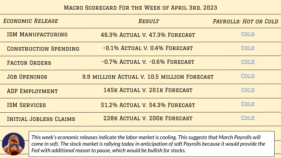 The market has decided that March Payrolls will showcase a cooling labor market, providing the Fed with additional reason to pause, which would be bullish for stocks.