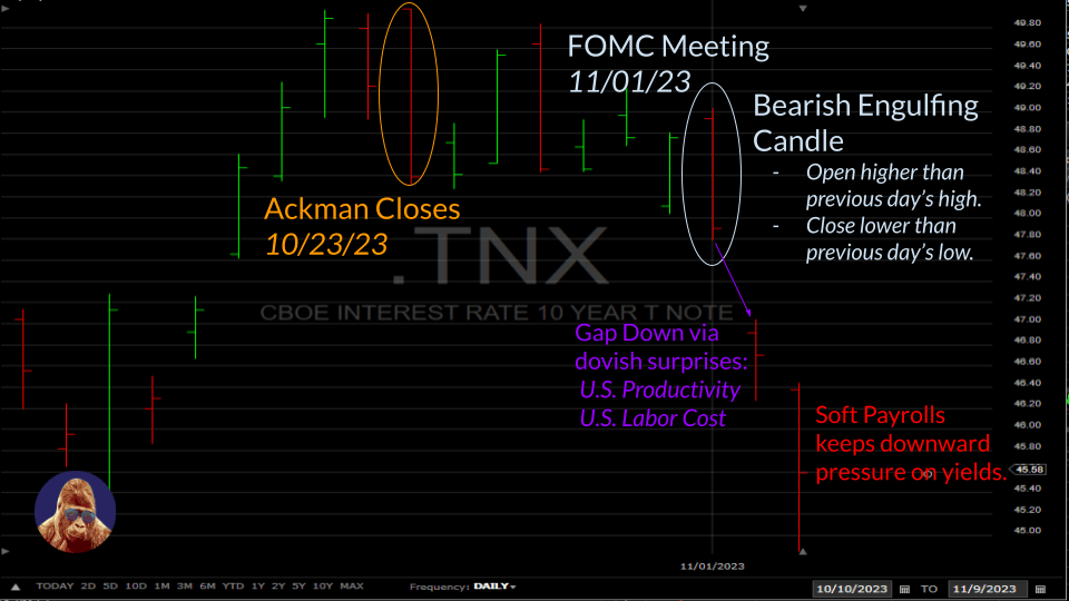 The significant point here is that this textbook technical breakdown reinforces my thesis that momentum players played a crucial role in driving the US10Y yield higher. I formulated this idea when I observed that the yield’s upward bias dwindled after Ackman closed his position. With Ackman’s de facto endorsement gone, there was no fresh conviction to press the short further. The breakdown didn’t happen at that moment because following him into the trade wasn’t enough reason to exit and momentum still favored the shorts. However, the situation changed rapidly as Wednesday’s bearish engulfing pattern was swiftly confirmed by Thursday’s dovish data. This shift in narrative led to a clear change in momentum, which, at this point, prompted shorts, who had artificially pushed and maintained the US10Y yield at artificial levels, to close their positions en masse, resulting in an unmissable ~34 basis point breakdown.