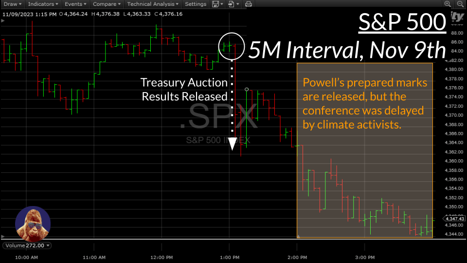 Moreover, the timeline doesn’t align with the story implicating Powell. The movement in interest rates that sparked Thursday’s reversal originated with the US30Y auction that concluded at 1 PM. Powell’s prepared remarks were not released until 2 PM. Delayed by climate activists, Powell didn’t begin speaking until later.