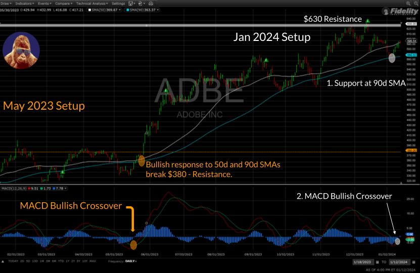 With the first two steps complete, the stage is set for a bullish move off the 50d SMA to challenge resistance at $630. Once that resistance level is broken, the path to $680 is clear.