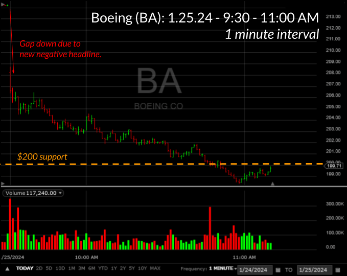A close under the $200 level is the exit trigger. This support level is a significant indicator of investor confidence. Failure to maintain it suggests a loss of that confidence and an indication that consensus is shifting toward the idea BA will disappoint when they report next Wednesday (1/31/24).
