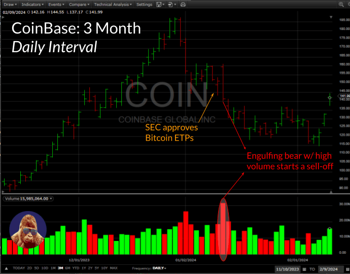 Coinbase (COIN): Traditionally, this stock’s performance correlates with Bitcoin (BTC). However, with the approval of BTC ETPs, the correlation may evaporate. Over 40% of COIN’s revenue comes from transactions. While COIN will earn fees as a custodian for many asset managers managing these ETPs, it’s uncertain if custodian revenue will offset a potential decrease in transaction revenue. The convenience of ETPs may attract investors away from using Coinbase accounts for crypto exposure. Judging by the price action on the day ETPs were approved, it seems I’m not alone in this belief.