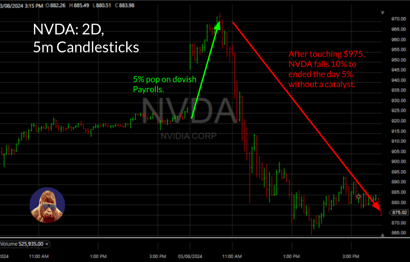 Some of you may have noticed Friday’s heavy tape despite benign Payrolls. Nvidia ended the day down 5% after initially being up by as much as 5% — a 10% swing. Although Crowdstrike popped 30% after reporting the best quarter in cybersecurity, the stock ended the week only up a modest 2%.