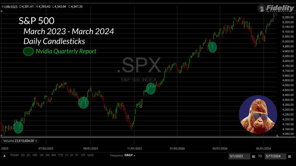 The chart above shows the S&P 500 from May 2023 through May 2024. The green dots indicate when NVDA reported earnings each quarter. These quarters capture Nvidia’s evolution from a semiconductor company to an AI darling. If you had bought the S&P 500 before every NVDA earnings release – as it was becoming apparent AI was the real deal – you’d look like a genius and need a bigger wallet.