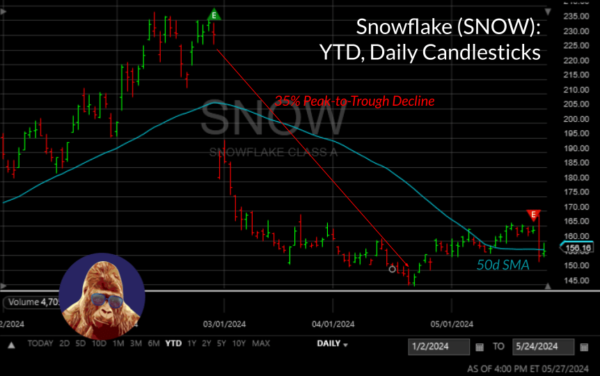 The same night as Nvidia, Snowflake reported earnings. Pre- and post-market trading saw a 5-7% boost, but when the market opened Thursday, the stock ended the day down over 5% below the 50-day SMA.