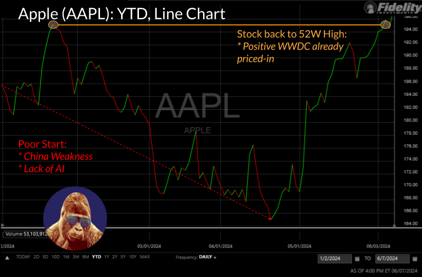 Apple’s Worldwide Developers Conference (WWDC): In the first four months of the year, Apple’s stock price dropped by 10% due to a popular theory that weakness in China and a lack of AI integration would allow competitors to threaten Apple’s iPhone-driven ecosystem. Since then, the stock has rallied 18%. While part of the rally can be attributed to better economic data from China, the price action clearly suggests the market expects WWDC to address AI.