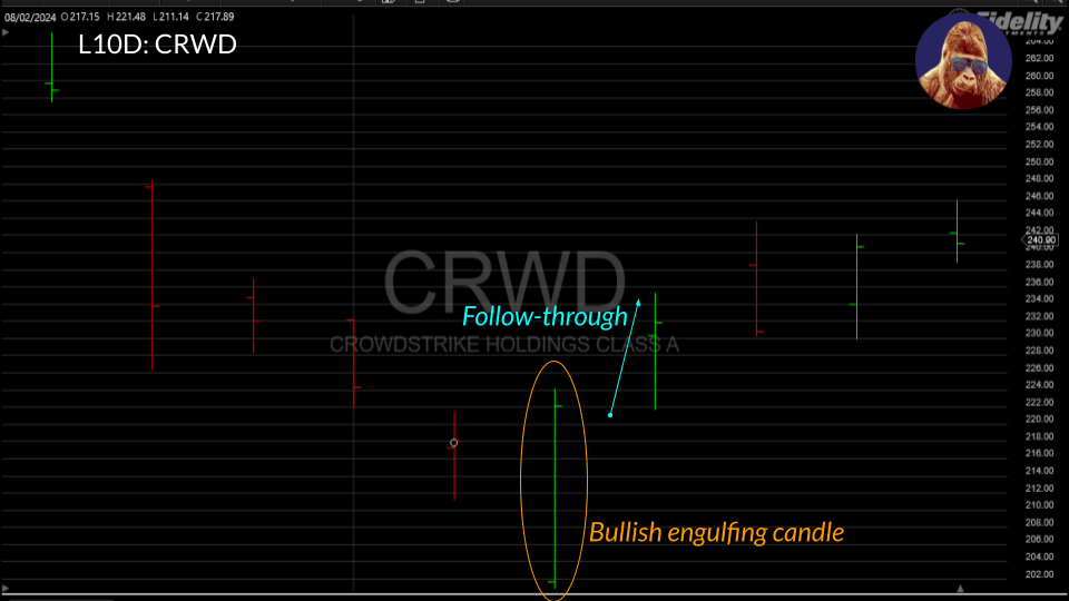 - Bullish engulfing candle: After opening lower than the prior red candle’s close and low, the stock rallied and closed above the prior candle’s high. This action indicates that while bears attempted to push the stock lower, the bulls decisively regained control.