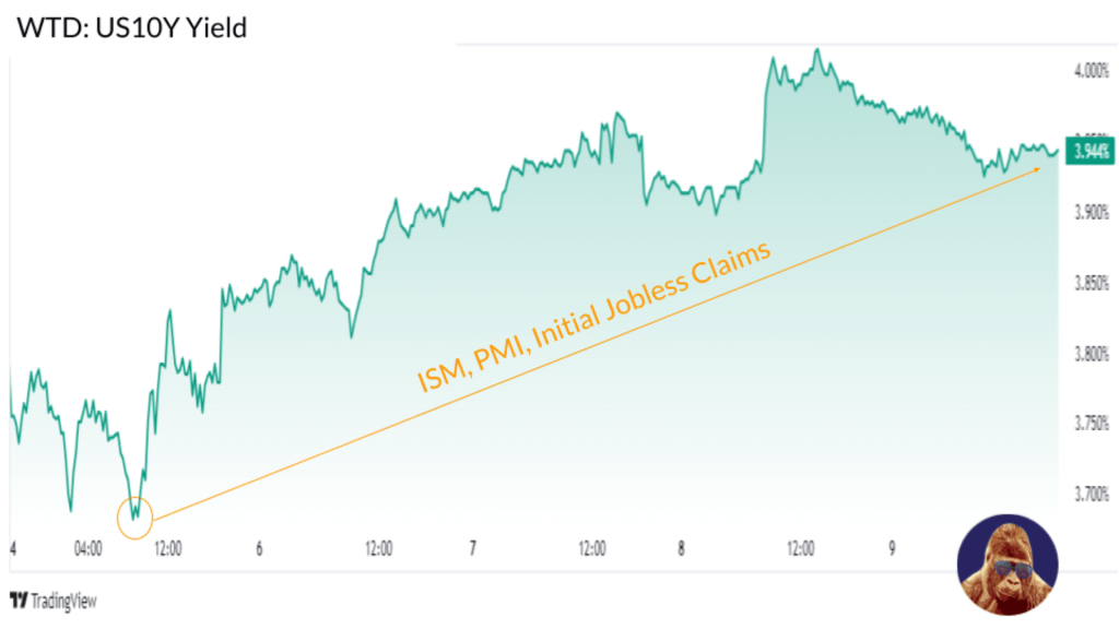 Last week, the market needed reassurance about the economy. ISM, PMI, and initial jobless claims reports provided that reassurance. Typically, these reports aren’t “market movers,” but they still managed to push the yield on the U.S. 10-Year Treasury from 3.7% to 4%. A 30 bps move in a single week usually requires more significant data like Payrolls, CPI, or PCE as a catalyst. The fact that these relatively overlooked reports had such an impact highlights just how sensitive the market was at the start of the week.