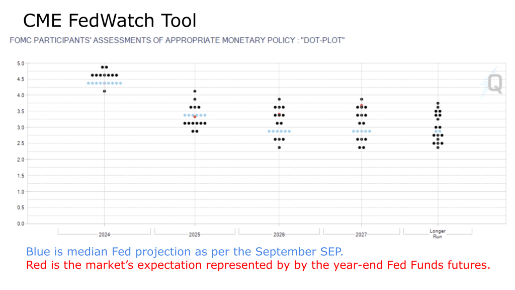 Currently, the Fed’s SEP and futures market are projecting Fed Funds between 3.25-3.50% by the end of 2025. If the Fed skips a few cuts, it would disrupt that outlook, breaking from the “goldilocks” scenario the market seems to be banking on.