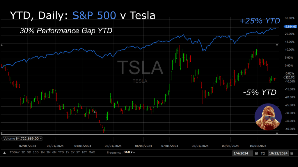 I’ve never invested in TSLA, but for what it’s worth, I’m more bullish on Elon Musk than I am bearish. Hot take, I actually like the aesthetic of the cybertruck. TSLA could benefit from a Trump win, given the administration’s stance on China and the constructive Musk-Trump relationship. That said, the stock has been left behind by both the rest of the Magnificent 7 and S&P 500.