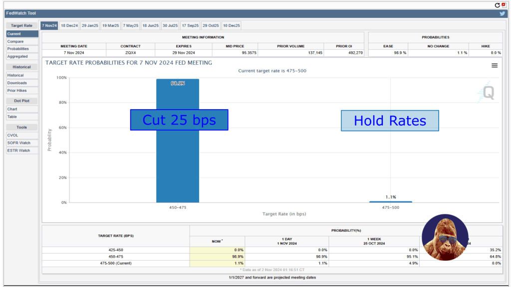 The market appears to be pricing in a 25 bps cut. Expect Powell to face questions on payrolls in light of strike and hurricane effects and on the new White House administration (even if the result is still in question). As usual, expect Powell to answer without giving the market any more than he intends.