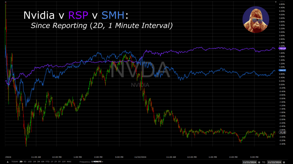 The report, while stellar, gave investors permission to rotate into solid companies that had lagged without scaring money out of the stock market altogether. Nvidia’s relative underperformance since the quarter, compared to the broader semiconductor cohort (SMH) and the market (RSP), illustrates this rotation.