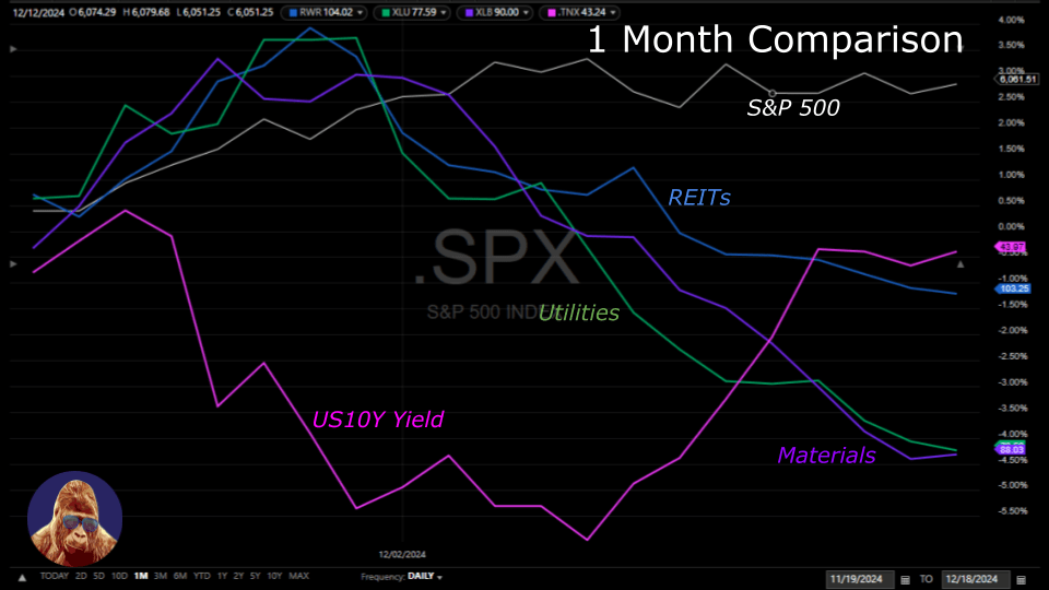 While the US2Y yield, sitting at 4.2%, obviously suggests the bond market sees little room for additional cuts, underperformance in REITs (RWR), Utilities (XLU), and Materials (XLB) paints a more compelling picture.