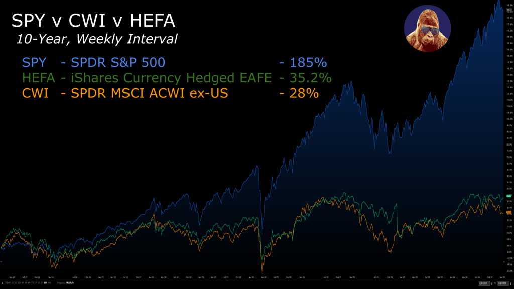 The problem is that, as the past decade has shown, these underdogs rarely outperform the favorite for any time period long enough to matter. Comparing accessible ETF options, the SPY – SPDR’s S&P 500 tracker – has well outperformed the CWI – SPDR’s MSCI ex-U.S. tracker – even if you hedged for currency using something like the HEFA.
