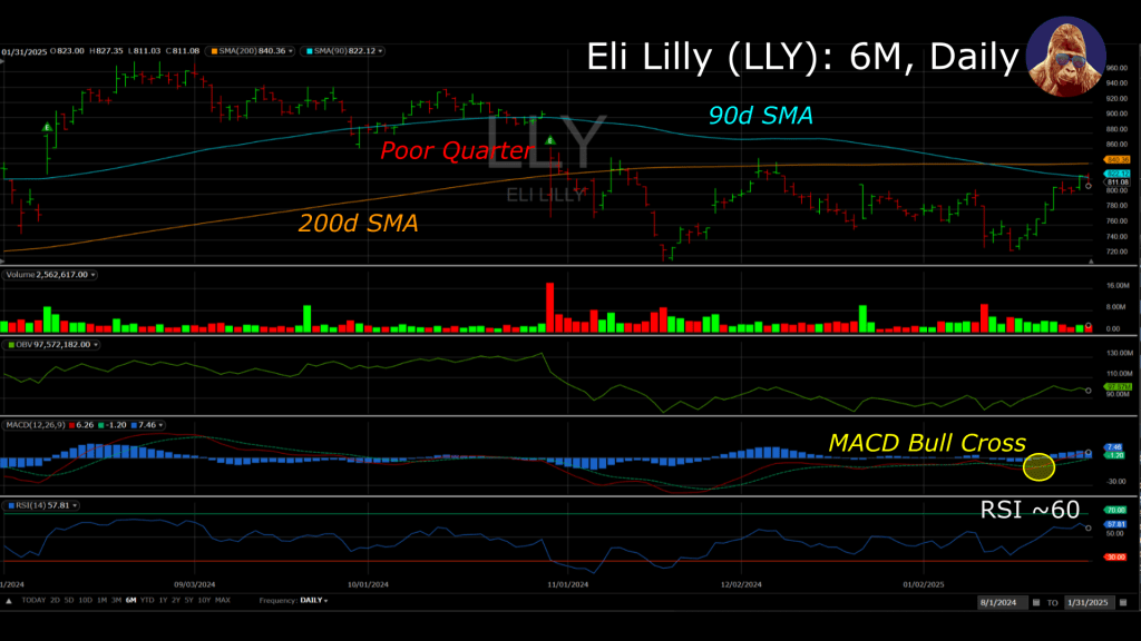 Now, the stock has mounted a notable comeback. LLY is above its 90d SMA for the first time since that poor quarter, is approaching its 200d SMA with momentum, and avoided gapping down in sympathy with its European competitor, Novo Nordisk.