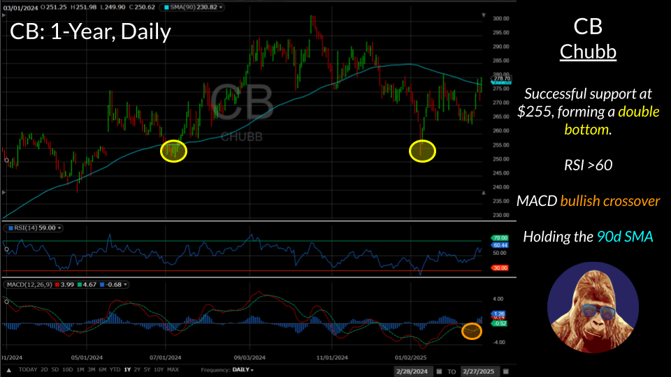 Chubb (CB), 11.5% of the IAK: Despite meaningful exposure to California homeowners’ insurance policies, the stock is above its 90-day SMA for the first time in 2025.