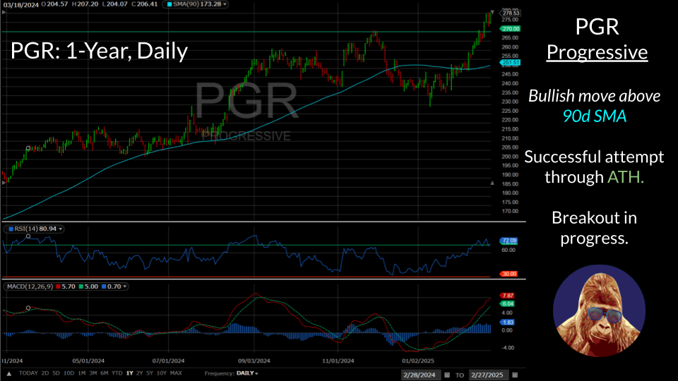 Progressive (PGR), 16.2% of the IAK: Consolidating at $280, about $10 above its prior all-time high.