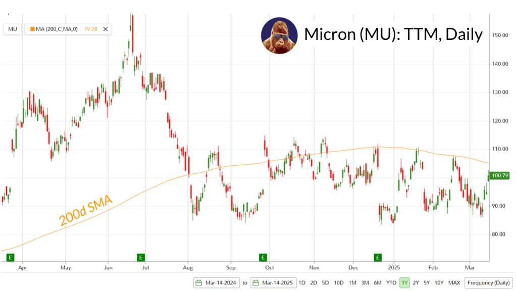 Since topping last June, MU has been range bound ($85-$110). Last week, MU defended the lower bound ~$85. At ~$100, expectations feel balanced for the quarter. While the sector hasn’t received the benefit of the doubt since the calendar turned, I see a plausible scenario where Micron benefits from increased orders as companies look to secure domestic semiconductor supply to avoid potential tariff-related disruptions.