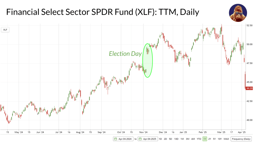 These names got slammed. The sector has given up all of its post-election gains and is down ~8% YTD. You could argue that these banks are no longer pricing in any of the upside associated with the Trump administration’s agenda for tax cuts and deregulation. In fairness, it’s unlikely they get to enjoy the full potential of that upside if tariffs send the global economy into recession. Not my base case, simply explaining why that upside is not likely priced-in.