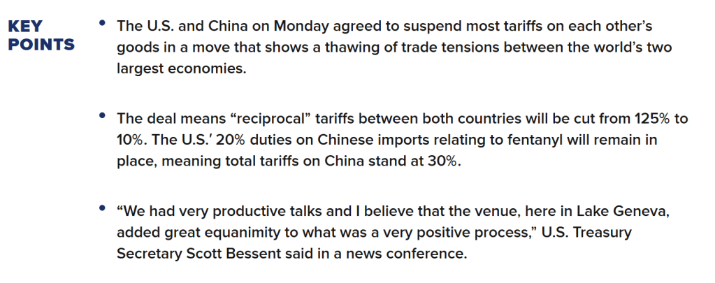 In a flat week for equities, the U.S. announced its first trade deal since the 90-day pause and set the stage for a productive weekend of negotiations with China in Switzerland. The Fed held rates steady, noting that economic resilience gives them room to evaluate how current policy affects their dual mandate.