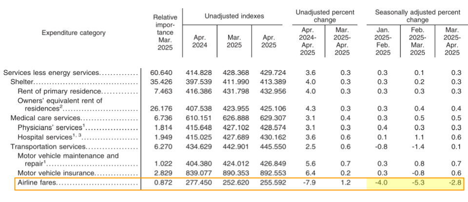 We’re already beginning to see it in travel. The airline fares component of CPI has been in deflation for the past three reports. Assuming services continue to carry a greater weight in inflation measures (>60% in CPI), I think that in the event we experience material goods inflation, it will be masked by the resulting disinflation/deflation in services inflation.