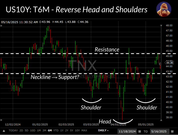 To start May, the benchmark US10Y yield executed a perfect reverse head-and-shoulders move. However, it was unable to break beyond resistance just a touch higher. Given the lack of new data over the next month, I see a backdrop where yields remain range-bound between the neckline at 4.325% and overhead resistance at 4.55%. In my opinion, a period of low bond market volatility fosters an accommodative backdrop for breadth expansion and single-stock breakouts as the broader averages consolidate.