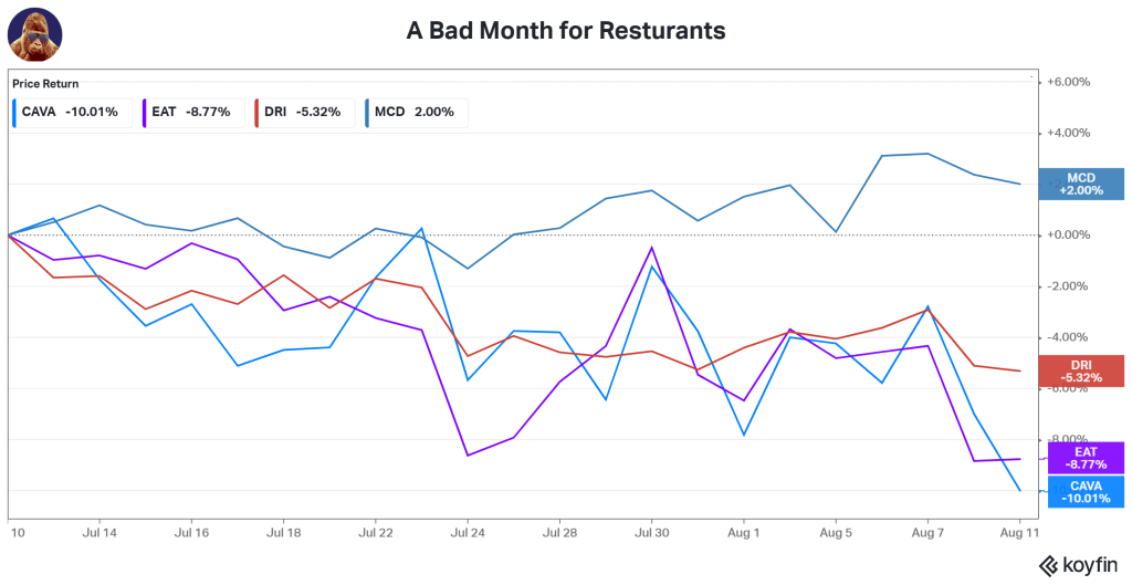 We’ll start with CAVA and EAT because of the shared narrative: concerned about discretionary spending. This last month, money has fled the restaurant space. Here’s a look at some of my favorites in the space that have been absolutely crushed during this capital flight:
