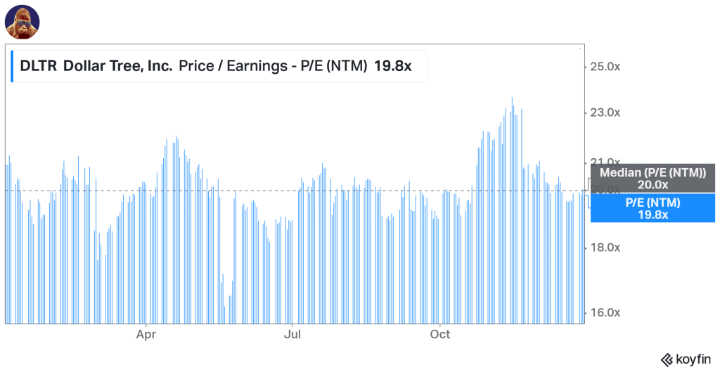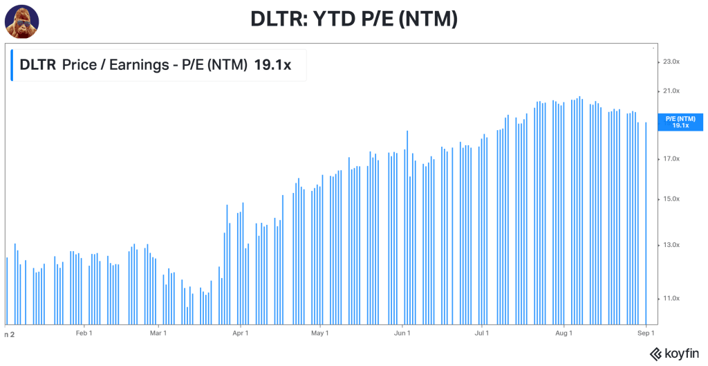 Right now, it trades at 19.1x forward, but did manage to achieve a plus 20 multiple. In the most recent episode of Charts and Checks, I mentioned there are market signals suggesting pockets of economic weakness. Dollar Tree trading at an elevated valuation is plainly one of them.