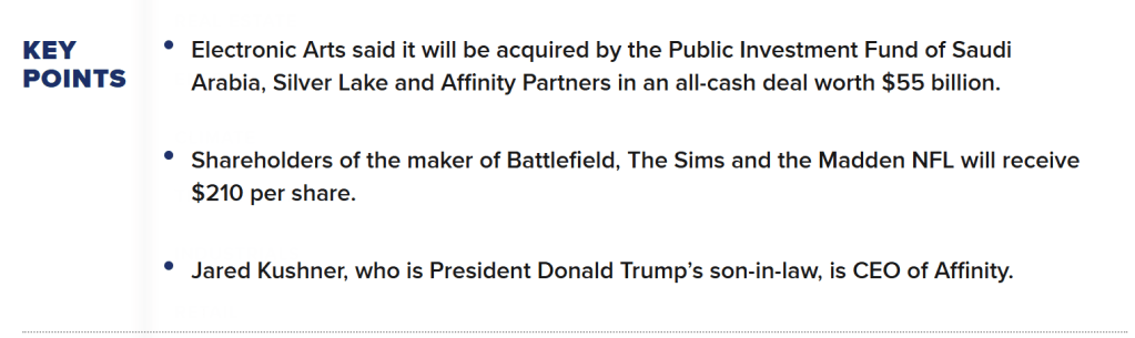 During a live edition of Charts and Checks recorded in the waning hours of Friday’s session, the WSJ reported that a consortium of investors was going to announce the largest leveraged buyout (LBO) in history to bring EA private for $50B sometime next week. The stock jumped to a valuation of around $48B, up 15%, on the news.