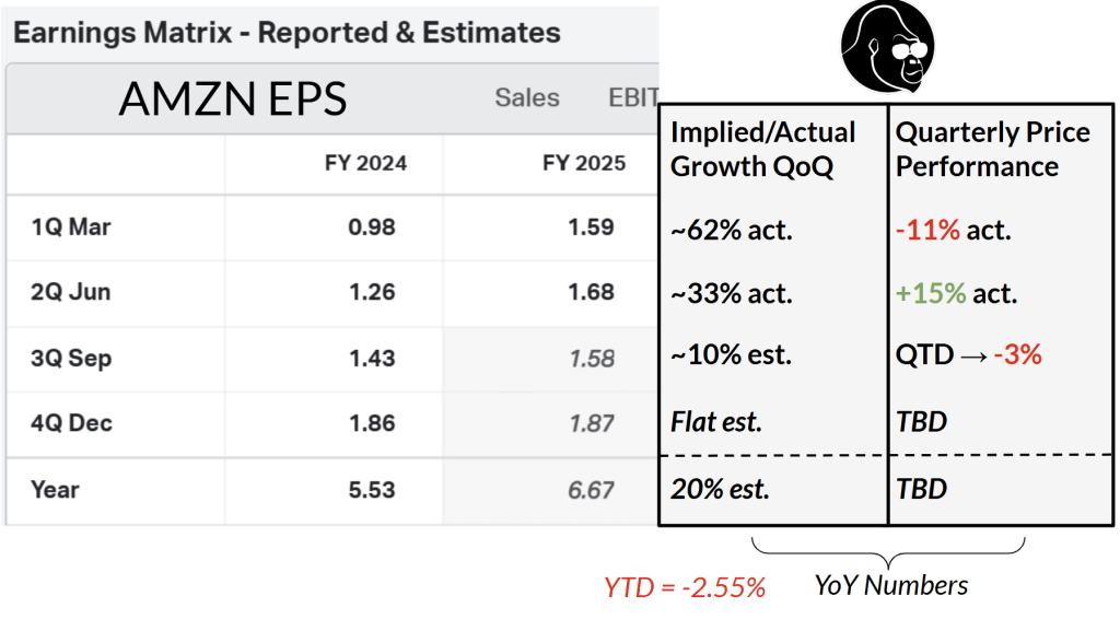 That said, Q3 needs to impress for this thesis to play out. Of course, AMZN could still be a chase for performance play without it. If we’re taking the S&P 500 to 7000 by way of the “chase for performance”, then AMZN will benefit due to its weight in the S&P 500. Regardless, after taking time to review current earnings expectations, I have come to realize more is riding on this quarter than I previously thought.