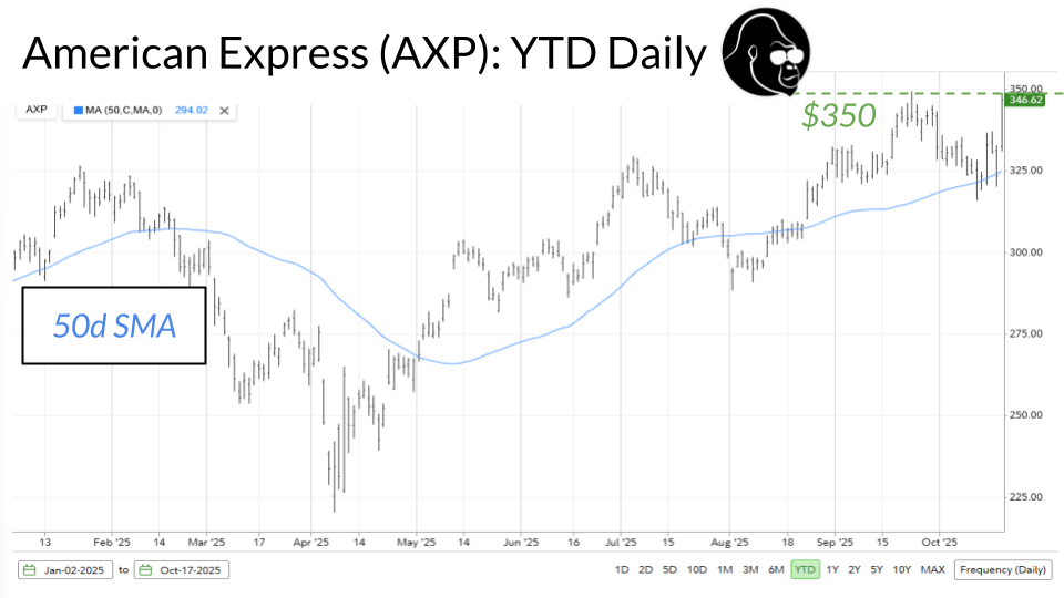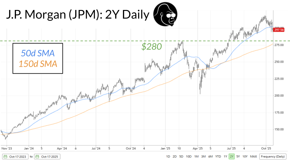 I would be focusing on JP Morgan, ticker symbol JPM, and American Express, ticker symbol AXP. For JPM, I’d be looking at the $280 level. That was prior resistance in February and will likely be the 150d SMA in the next couple of weeks. As far as JP Morgan is concerned, we want to see resistance in February become support today in October, and we also want to see the 150d SMA hold up as a strong support for the bulls.