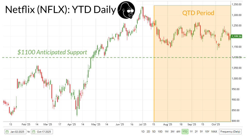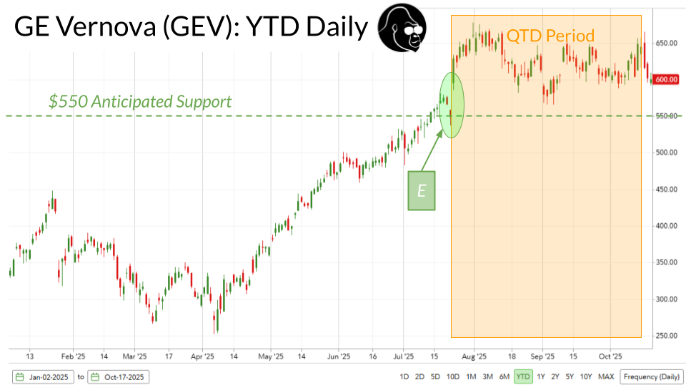 With respect to Netflix and GE Vernova, neither name has done much such reporting their last quarter. Netflix has actually down quarter to date. I don’t think there is any reason to believe momentum has changed since the prior quarter, which was nothing short of amazing despite what the stock has done since then. When I look at what happened in Netflix over the last three months, I chop it up to just saying it appears as though the stock got a little ahead of itself coming into the quarter, and I hope that another quarter of equal caliber reignites interest here.