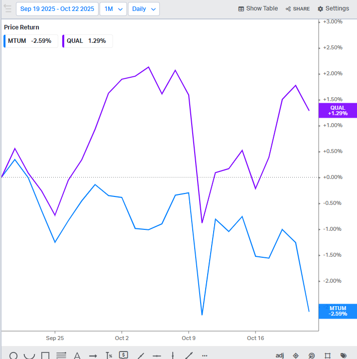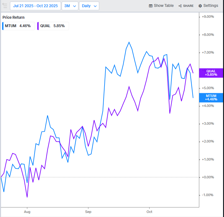Year to date, momentum is crushing it, but in the last three months, quality has actually outperformed with most of it coming in the last month. Now, given that there really wasn’t a change in the fundamental outlook, I chop up this rotation to some exhaustion on the upside for the momentum cohort. There is such a thing as too much or too fast, too quickly.