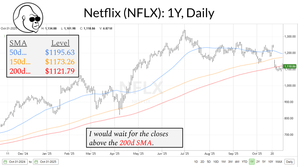 Personally, I’m actually most excited for the news we got from Netflix. The 10 for one stock split could meaningfully reignite interest in the name. As we can see here on the charts battling a couple of major moving averages, I would let people know when I get in, but if we can get past the 200 day – which is where it’s battling now – the next stop is 150d. If you get past that, the only resistance to revisiting the all-time high is 50 day.