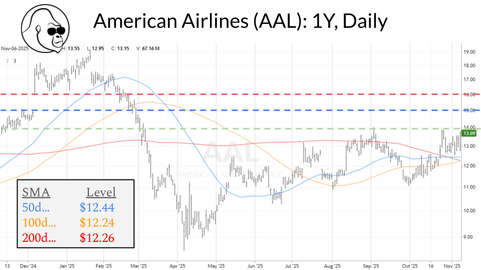 The thesis is that once the government reopens, AAl gets above $14, permitting a revisit to resistance at $15 and $16. That is where I would look to take profits.