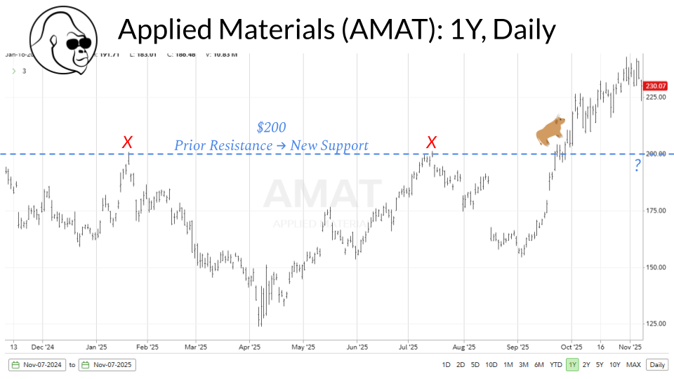 Applied Materials is a vendor of semiconductor manufacturing equipment. In the past, their business with Intel has been a headwind, but now that INTC appears part of a legit turnaround… maybe this headwind subsides or, even better, becomes a tailwind. I am not long here either, but the levels to watch are resistance at the ATH, about $13 above Friday’s close, and support at $200 where it made a prior high in July.
