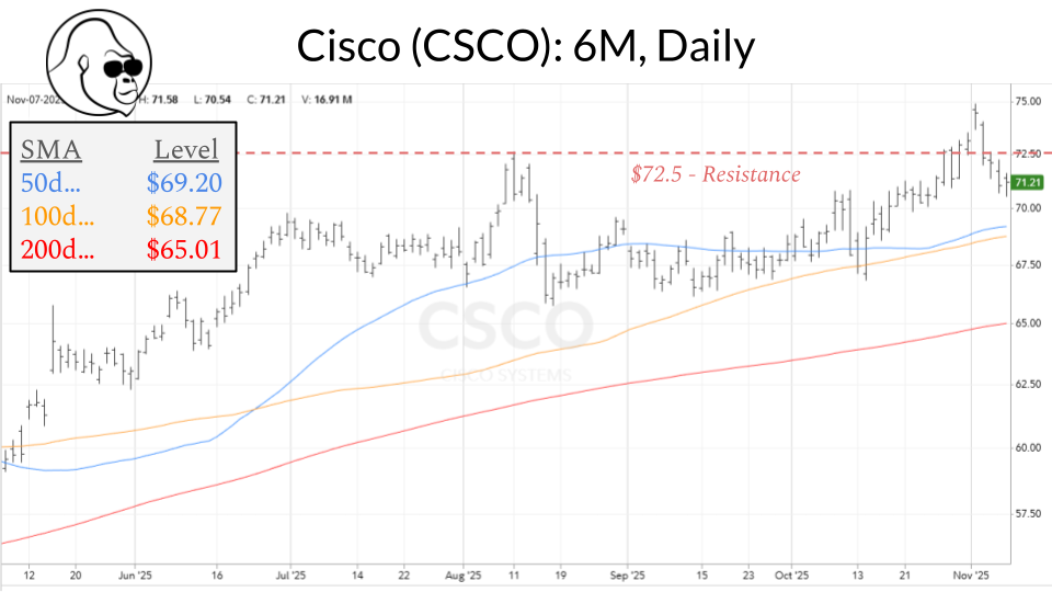 CSCO’s chart is fine, still above major moving averages with positive slopes. That said, it trades around 17.4x FWD earnings but 27.9x trailing, which implies a pretty meaningful pick up in earnings over the next 12 months is expected… so, CSCO needs to show progress there.
