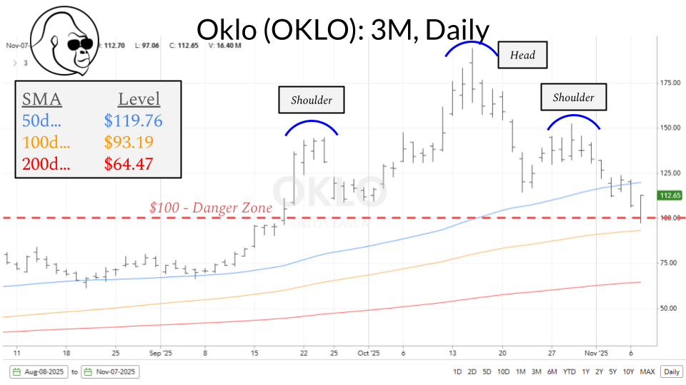 Before moving on, I think it is worth pointing out the head-and-shoulders pattern underway in OKLO. If it doesn’t hold $100, next level of support is the 100d SMA at 91.7. Honestly, this creates a nice bearish-put spread opportunity between current market price and that ascending 100d SMA. If I end up doing it, I’ll write a little post about it so those unfamiliar with that option strategy can see it in real time.