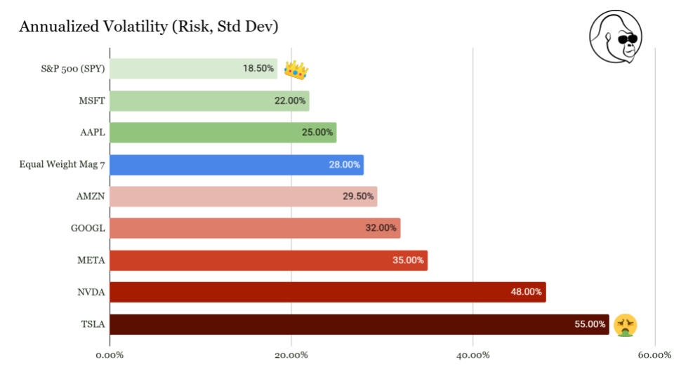 To answer my query, I created an equal-weight Mag 7 portfolio (dividends reinvested, no rebalancing) and measured it against the individual names and the S&P 500 starting November 2023, marking the moment ChatGPT captured the public’s imagination, and perhaps changed the trajectory of the economy, [seemingly] overnight.