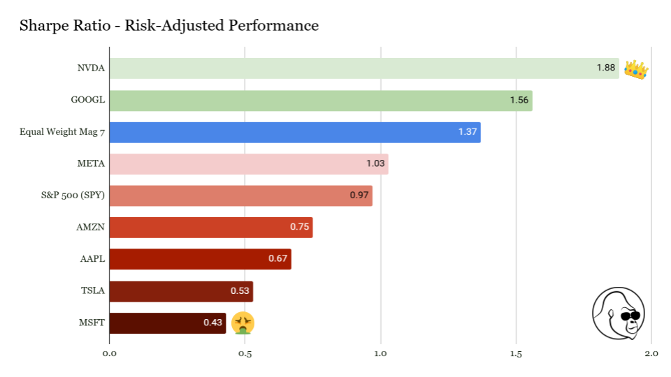 The numbers speak for themselves. In raw return, the equal-weight portfolio beat the S&P 500 and five of the seven constituents. There was more risk associated with those returns, as indicated by standard deviation and drawdown, but the excess return justified the risk as per the Sharpe Ratio. Only Nvidia and Alphabet – what a turnaround there this year – delivered a superior Sharpe over the 2-year period.